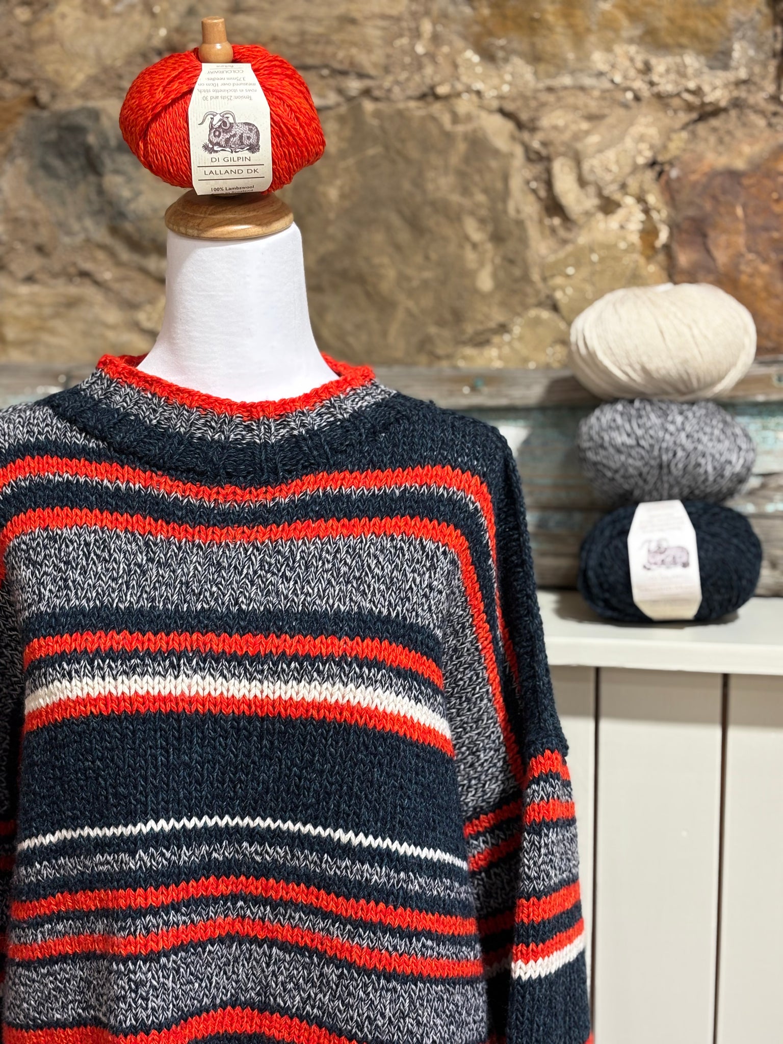 a couple of accent colours in the Lalland DK, 2 strands knitted together. We have put together a kit for